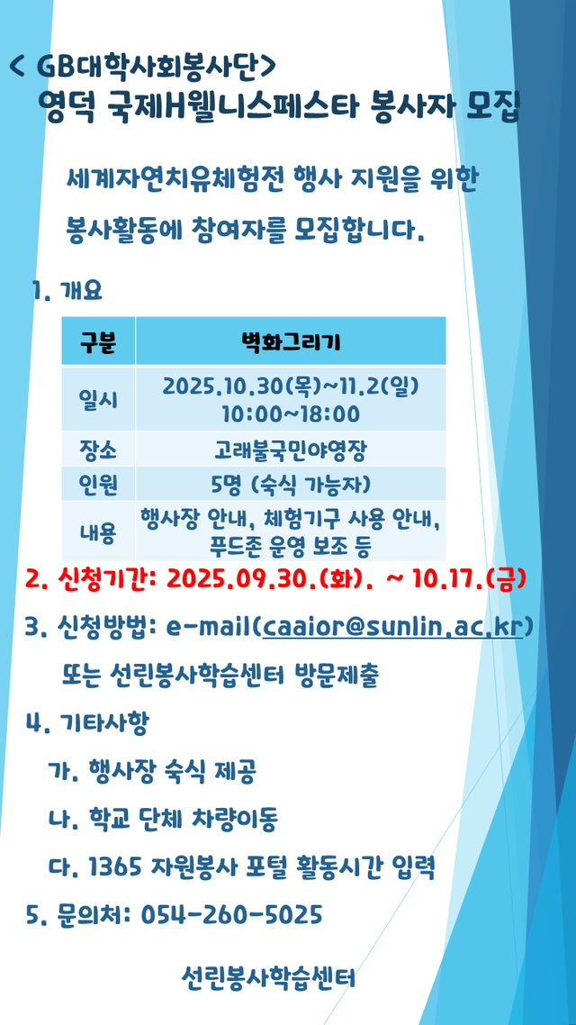 영덕에서 진행되는 국제H웰니스페스타 행사지원 봉사자를 모집합니다.